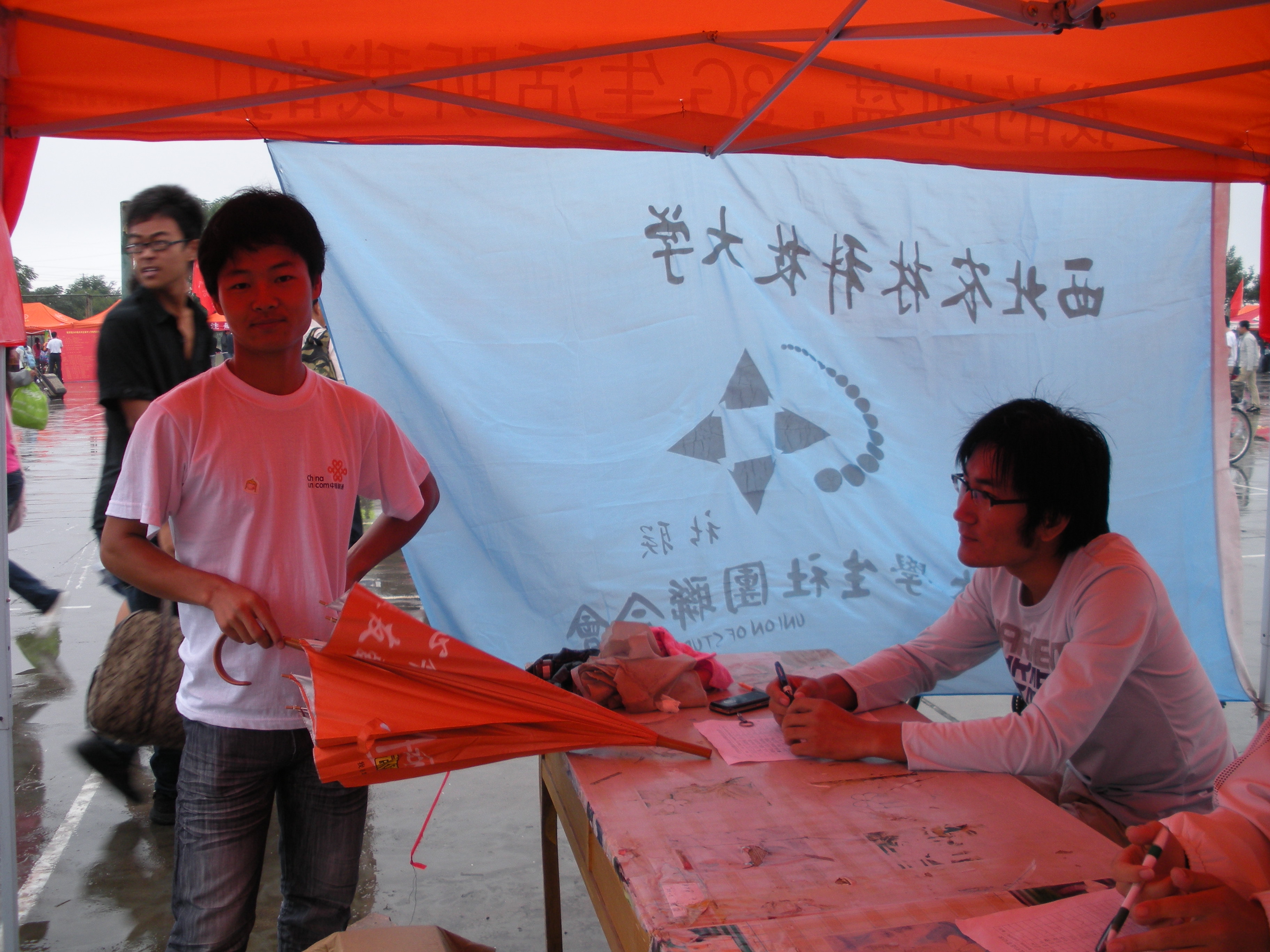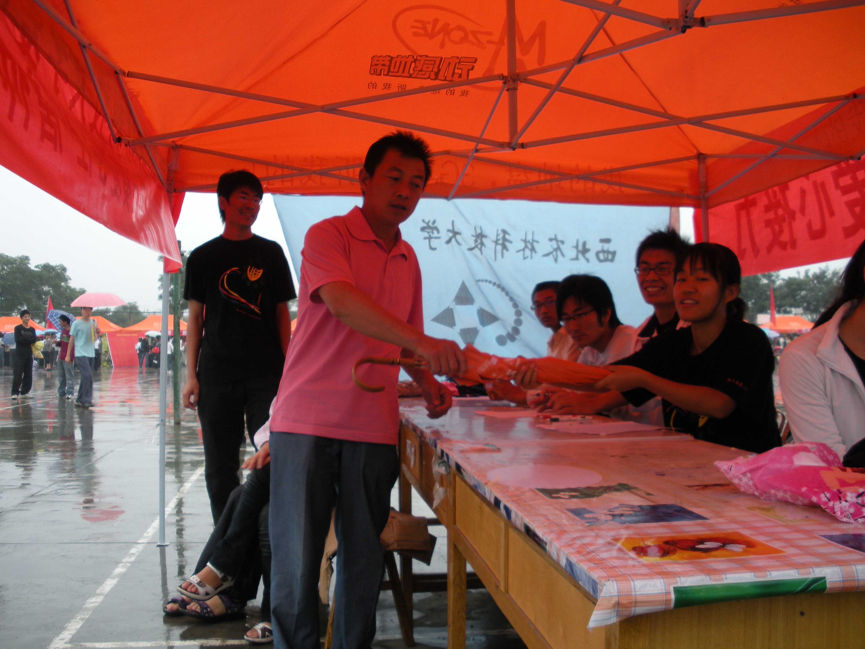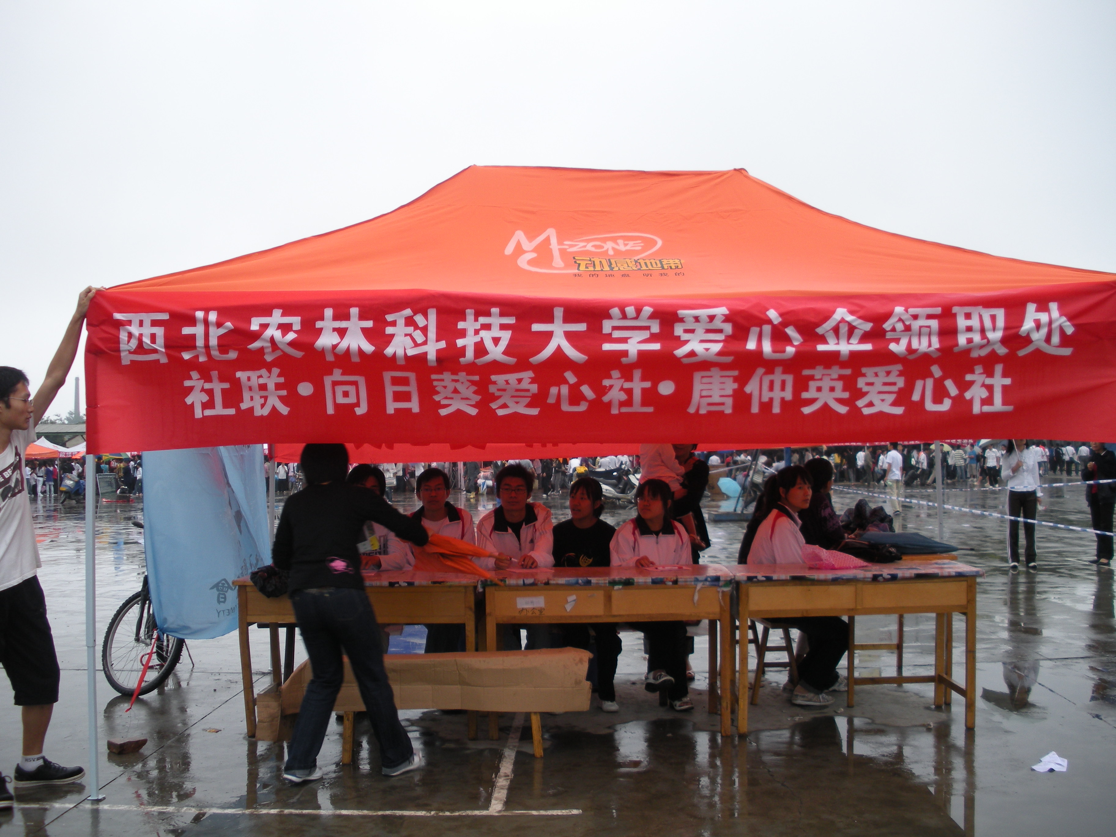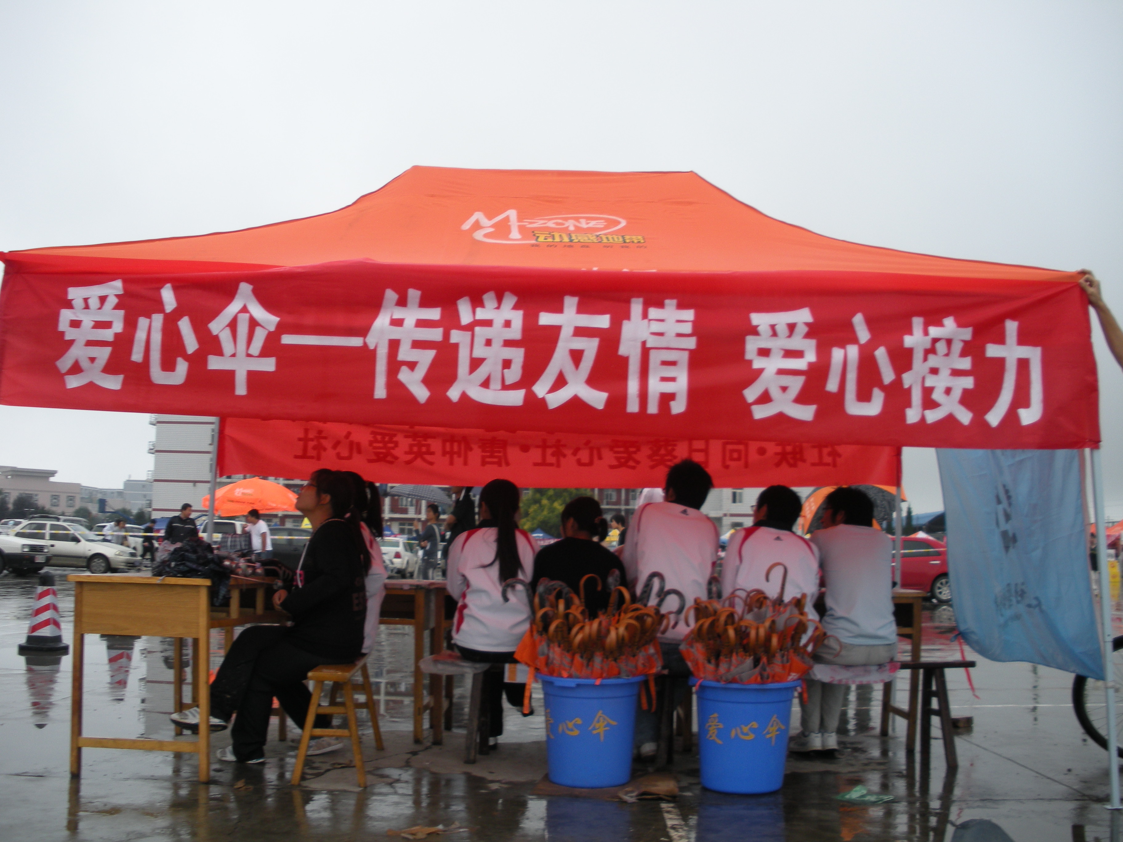 28日晚,社团的同学们连夜向社团成员征集伞具50余把,校团委也通过移动公司征集了150把伞具和一顶帐篷。经过连夜工作,29日清早,我校新生接待处悄然架起了一个爱心帐篷,就设立在校车停车处旁边,让未带伞具的新生一下车就可以用上“爱心伞”。