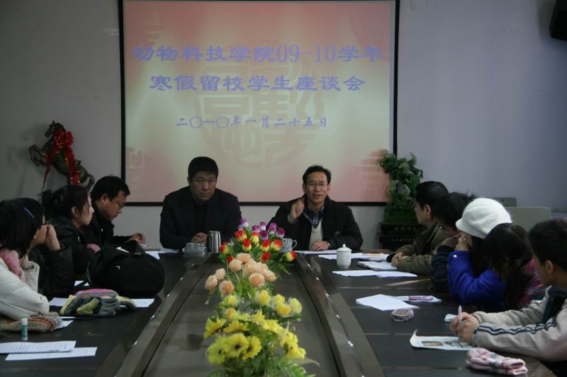1月25日下午,动科学院召开寒假留校学生座谈会,就寒假学生工作进行了安排。院党委书记闫祖书、党委副书记吴继东、假期值班学工干部及32名留校学生参加了会议。