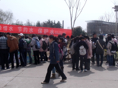 3月22日是世界水日,义务环保协会在北校西区超门口举行了以“珍惜水,节约水,保护水”为主题的校园节水宣传活动。
