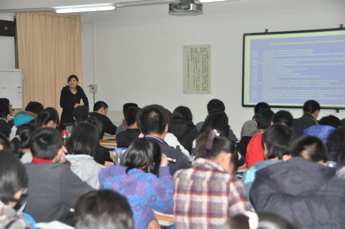 报告会上,王昕副教授用全英文PPT向同学们详细介绍了生物技术的含义、发展历史、在现代生活中的应用及相关的尖端科技,使同学们对生物技术有了进一步的认识和了解。结合丰富真实的图片,王盺副教授生动讲述了我校动物科技学院的学科基本情况、学科基地和平台建设、学科队伍建设及学术成果等学科建设情况。她表示,非常欢迎同学们选择动物科学学科方向,将来为动物科学学科的发展做出积极的努力。