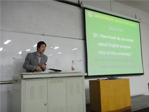 报告会上,田志强副教授以提出问题的形式切入主题——“How much do you know about English program at this university; How much do you know about English program in the country”,他结合外语系的发展历史和社会英语发展形势,详细地为学生分析了英语作为当今最受欢迎和最热门专业之一的现状和前景。接着向学生询问了英语学习的相关情况,在“Difficulties of learning English”中深入解析了学习英语过程中存在的困难,就“Qualities needed”给出了建议。他结合学院学习英语的成功案例,鼓励同学们以认真严谨的态度去努力学好英语。