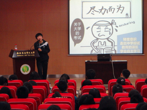 10月19日晚,由校团委主办、外语系承办的“同龄人谈成长”系列报告会在北校区绣山活动中心北报告厅举行,外语系2010级邓凤鸣同学以“纠结de成长ing”为题为低年级同学传授了自己在大学里规划时间的经验。