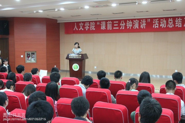 近两年来,人文学院在校团委的指导下,积极推广“课前三分钟演讲”活动,通过活动扎实的开展,使参与者收获成长,提升能力,不少同学都在网络平台或心得体会中提到了感触与收获,来自社会学122班谢晓萌同学说到:“也许一次演讲并不能使得你的生活发生大变化,但是它必定会对你的思想产生影响,无论是对演讲者还是听众。”