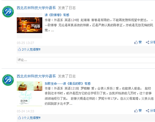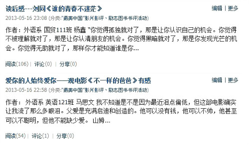 本次活动在大学生喜爱的人人网上展开,以亲近、简单、便捷的方式让广大同学都能积极参与进来,为同学们互相交流提供了一个良好的环境,培养了同学们读励志图书、看优秀影片的兴趣。