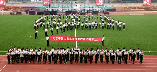 9月1日下午,经管学院在北校田径运动场举办以“弘扬爱国精神,敲响时代警钟”为主题的纪念抗日战争胜利69周年列队型朗诵活动,200多名新生参与。
