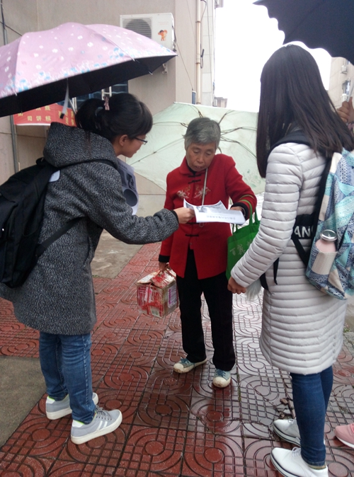 活动过程中,志愿者向社区居民发放宣传单,大力宣传环保知识,倡导人们生活简单化、环保化,并针对“白色污染”提出多条实用建议,如购物时自带布袋、拒绝一次性塑料袋等。社区居民认真听了志愿者的讲解,纷纷表示自己会减少使用一次性塑料袋。在宣传过程中一位在社区散步的老奶奶跟我们聊了起来,她说:“自己去菜市场买菜就从来不用卖家提供的塑料袋,都是自己带一个菜篮子去买菜,买了直接装在篮子里,既方便又环保。”旁边的同学忍不住为奶奶的行为喝起彩来,表示要向奶奶学习,学习这种绿色环保生活方式。