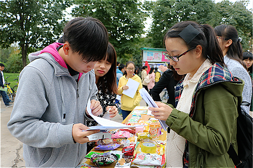 为了普及食品添加剂的有关知识,西北农林科技大学文明使者阳光支队联合食品学院社会实践部于10月28日在北校区西雕处举行“从你的全世界路过,谁懂你?”的有奖竞猜暨签名活动。此次活动活动形式新颖、趣味性强,吸引了许多同学前来了解并参加活动。其中,有奖竞猜活动无疑为一大亮点,活动设有一等奖、二等奖、三等奖,参与活动的同学们可以通过指出一些常见零食中的食品添加剂获得不同的奖品。这个看似简单,实则难度性较大的有奖竞猜活动成为西雕火爆一景。活动期间,有很多同学主动在“从你的全世界路过,谁懂你?”的宣传横幅上签字,并同文明使者团和社践部成员讨论食品添加剂的有关问题。