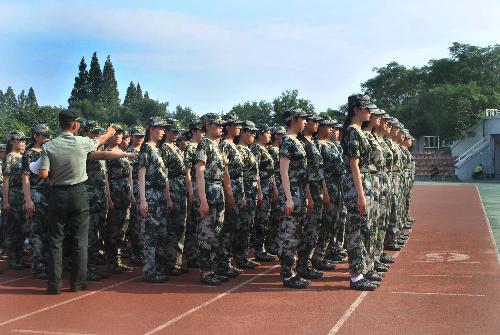 炎热难耐的天气使训练难度增加,在教官细心的指导下,五连的男生慢慢调整军姿,不时有人打报告,得到教官同意后迅速掏出纸巾抹去脸上大滴大滴的汗,又立即恢复军姿,不曾有半点偷懒。田径场的另一边,二连的女生们颇有“巾帼不让须眉“之势,队列的整齐度、军姿的挺拔飒爽丝毫不输男生。中暑头晕的女生时不时被送出队列到阴凉处休息,剩下的人反而不曾气馁,士气更盛,似要与这严酷的军训第一日拼个高低。点点汗水折射出阳光的热烈,诉说青春的激情。