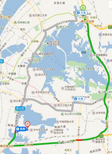 3. 武汉火车站到会议地点打车路线:约1 h,23.1 km,65元(二环线);约45 min,32.7 km,90元(三环线)。